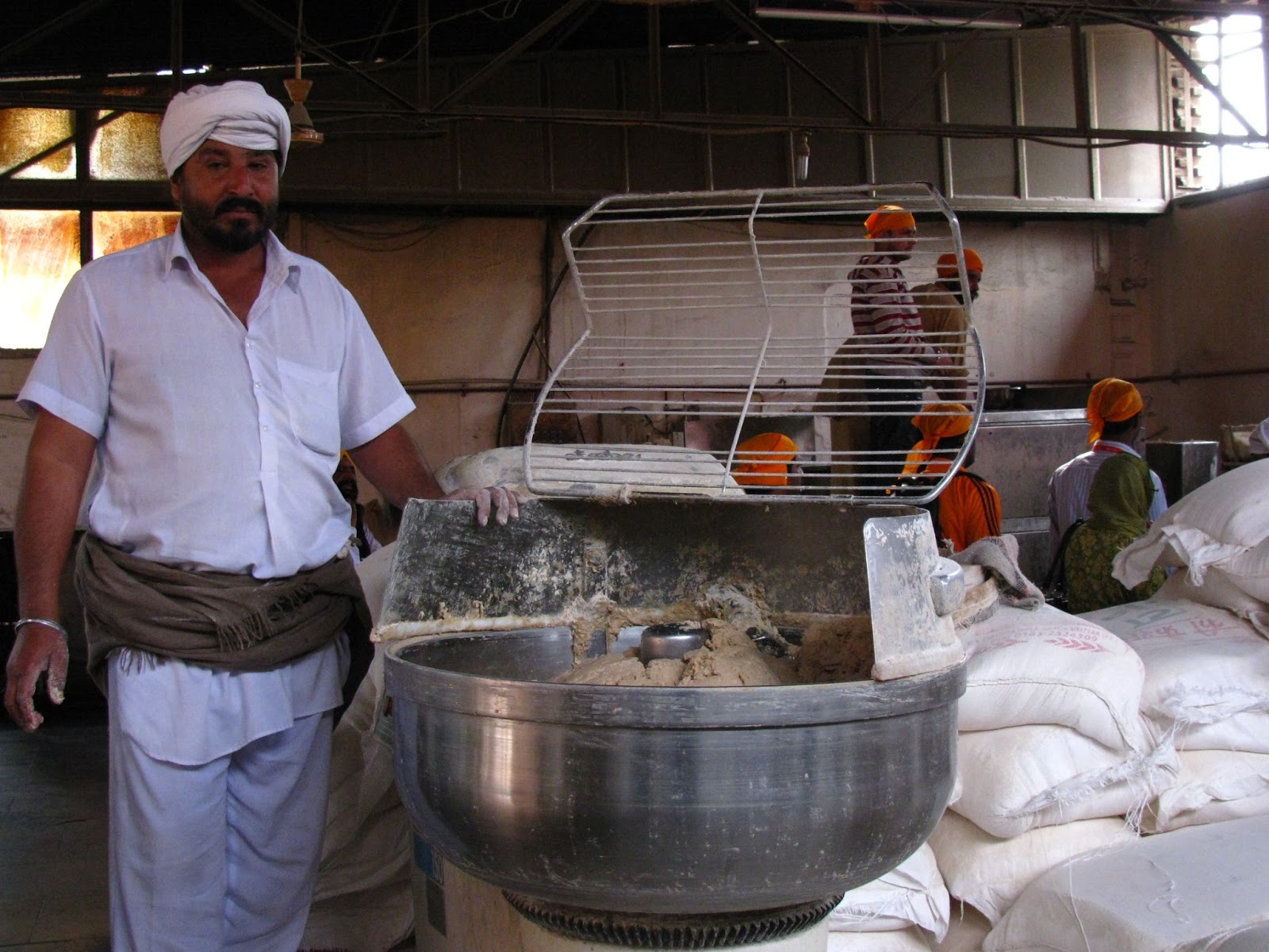 After Langar, we are guided by the President to where the food is prepared. We get a first hand look at the process. Many of us had actually wondered how this was done for sooooooo many people everyday (We heard something about 80,000 people being served Langar everyday). We see the people peeling onions, and the tubs full of raw vegetable and someone operating the machine that prepares the aata for rotis and people making rotis and another person stirring something in the hugest karhai you’ve seen.